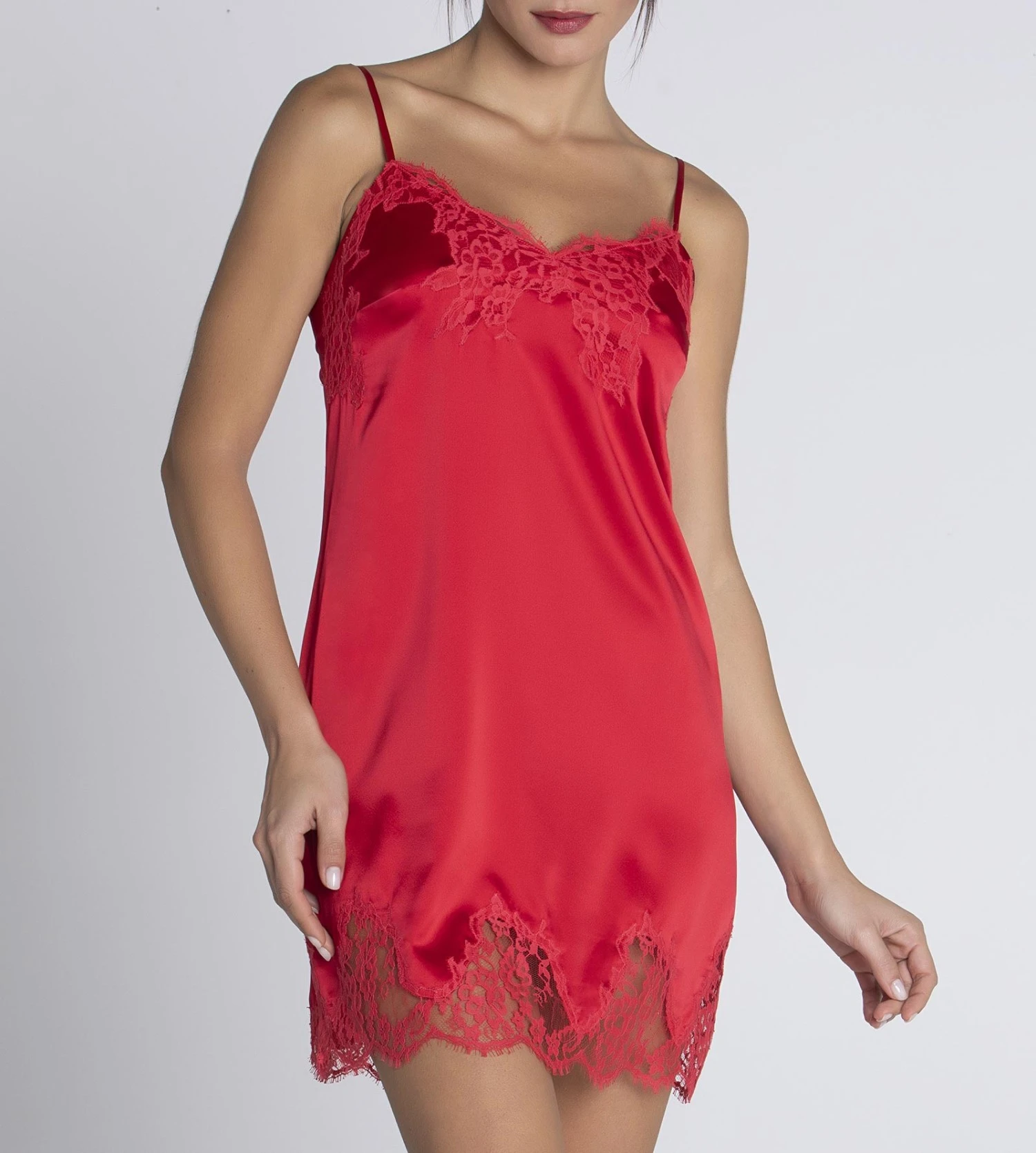 Nuisette à bretelles fines légèrement évasée sur le bas. Longueur dessus genou. Nuisette en satin de soie. Incrustation de dentelle de Calais. Bretelles soie.